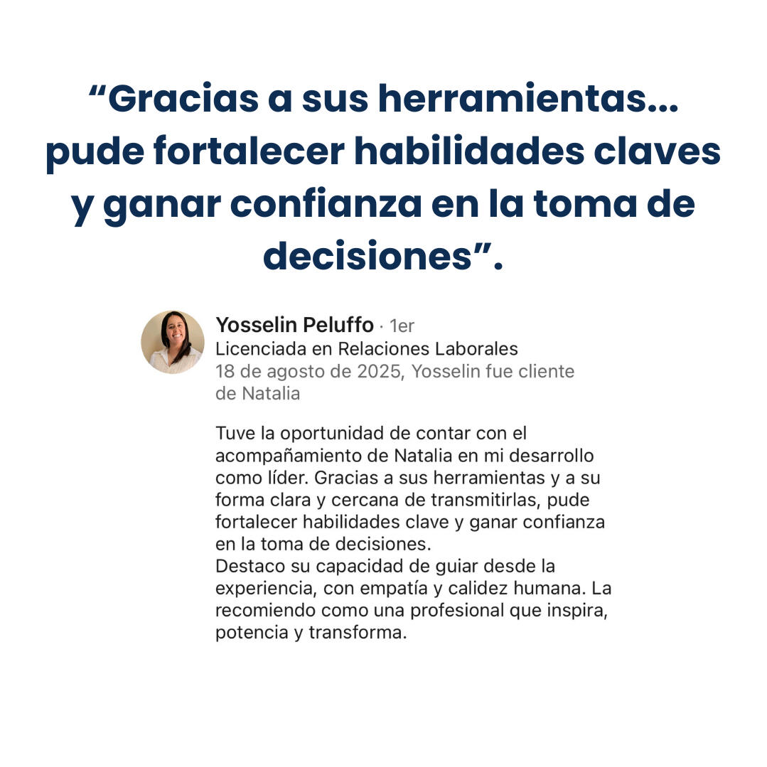 Natalia, es Licenciada en Relaciones Laborales. Se desempeño durante años en una empresa de más de 800 colaboradores, capacitando, desarrollando líderes, seleccionando talentos, fue reconocida por su nivel como Representante de cultura organizacional dentro de la empresa. Luego se abrió su propia marca y comenzó a liderar su negocio y desarrollar líderes.Una persona con un afán de siempre aprender más, lo que la caracteriza, es que crea sus propios métodos y estrategias uniendo toda su expertis y formación, en disciplinas que logran un alto rendimiento en las líderes y sus equipos, cómo: Neurociencias, PNL, EFT - Tapping, Comunicación asertiva, Coaching Ejecutivo, Líder Coach, Neurocoaching, entre otras.Sus programas son prácticos, estratégicos, con técnicas y herramientas que te llevas desde tu primer encuentro, listas para aplicar.Ha desarrollado decenas de líderes en diferentes rubros y sectores. Tanto a nivel organizacional - corporativo, como líderes empresariales con sus propias empresas y equipos.Bienvenida a potenciar tu liderazgo e impacto en los demás. Estás en el lugar correcto.