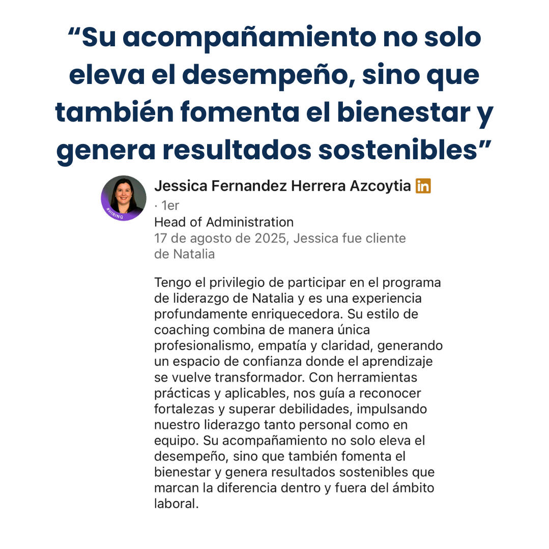 Es un proceso 1:1 basado en el MÉTODO LIDERACOACH™, diseñado para líderes que quieren trascender la gestión tradicional y convertirse en referentes de influencia, comunicación asertiva y resultados sostenidos en el tiempo.En este programa recibirás herramientas prácticas, aplicables y efectivas, listas para aplicar desde el primer día con tu equipo. Con ellas acelerarás los resultados de tu área, potenciarás el rendimiento de cada colaborador y elevarás tu impacto como líder.No se trata solo de optimizar tu equipo: te transformarás en la líder capaz de sacar el máximo potencial de cada persona, implementando estrategias prácticas, adaptadas a tu equipo y a los desafíos específicos de tu rol.